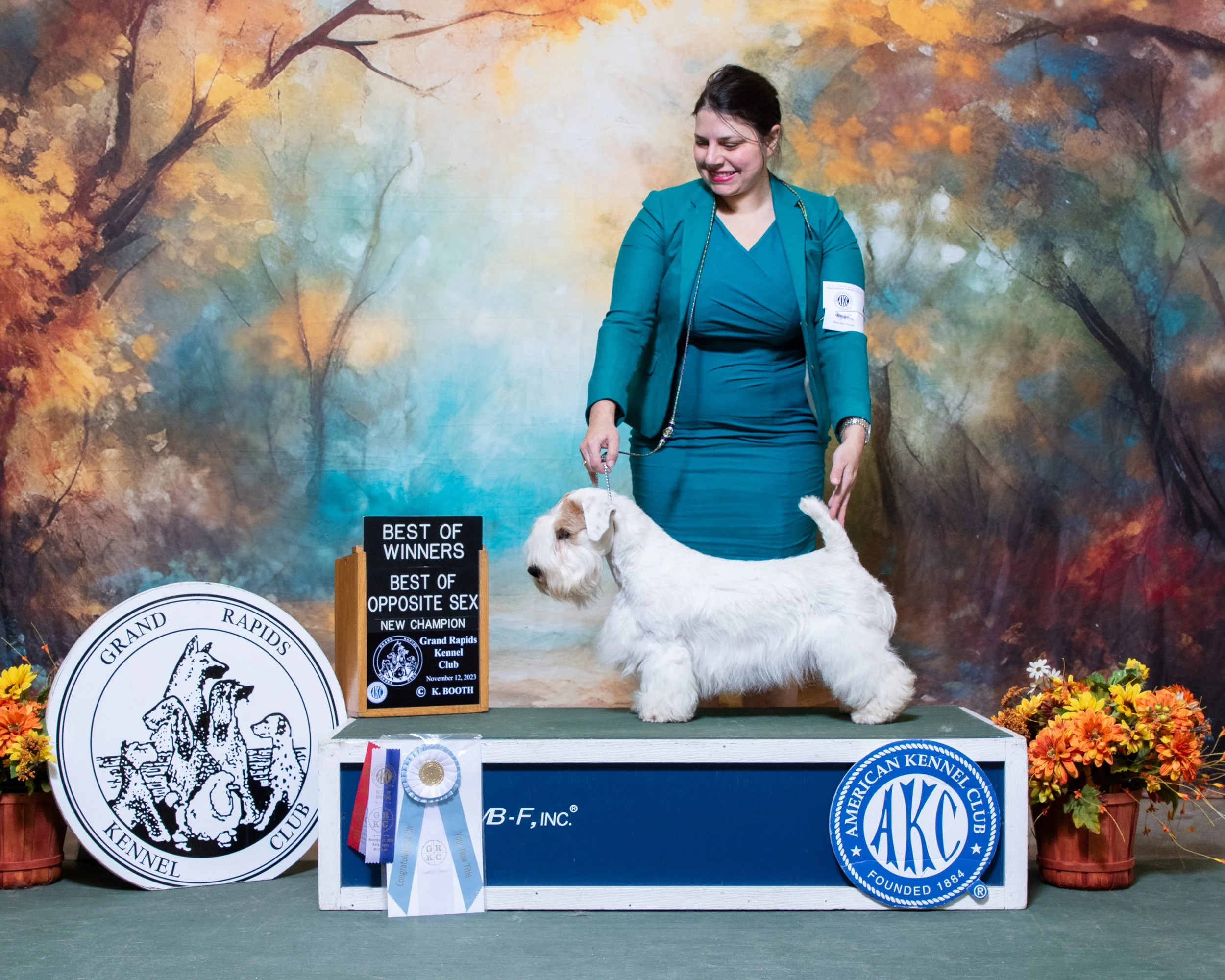 Bugs is the first champion bred by Aimee Koch of Bespoke Sealyham Terriers. Bugs is owned by his breeder and Kate Flack of Alibi Sealyham Terriers.